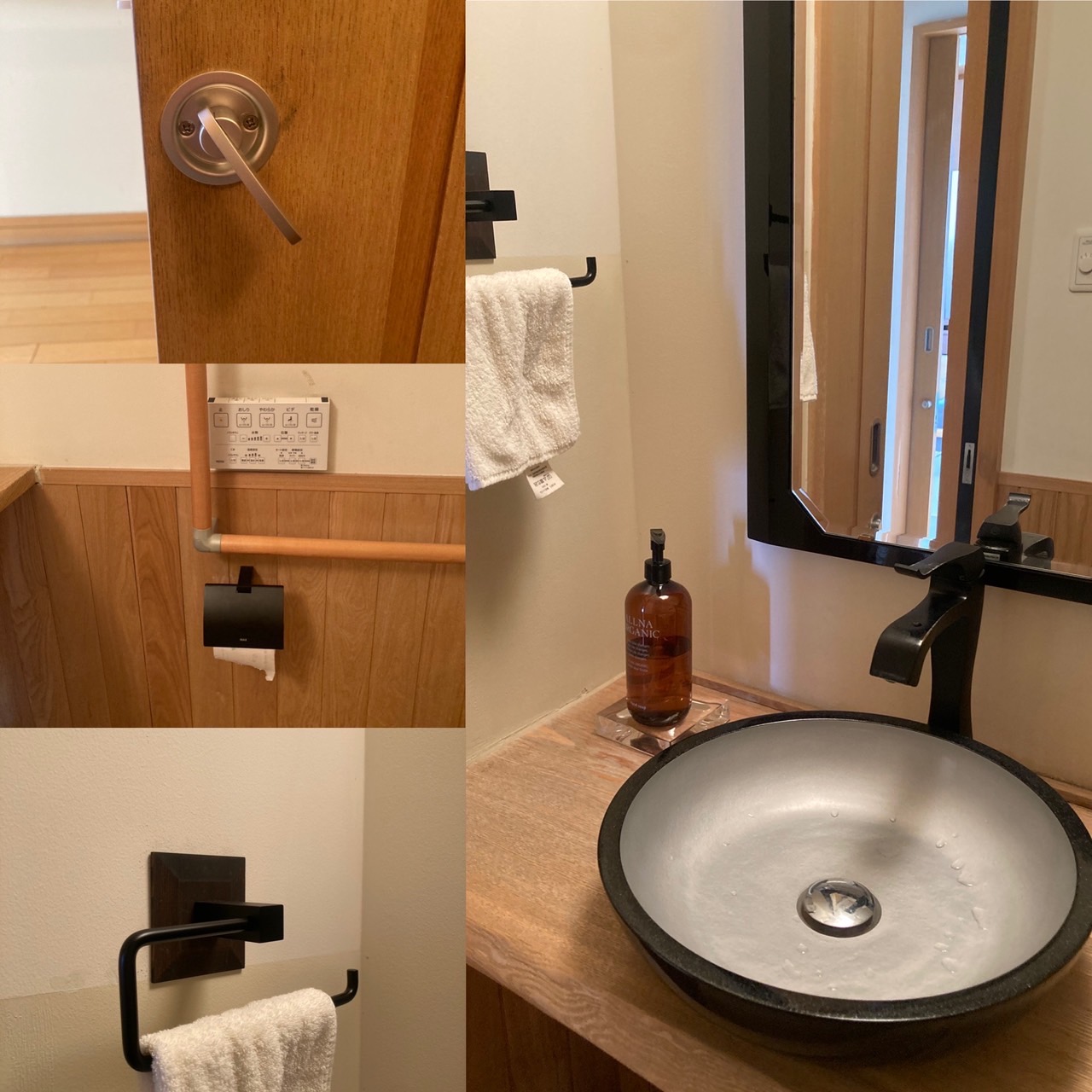あわせて、手洗い器に合うタオル掛けとペーパーホルダーもスタイリッシュに変更。